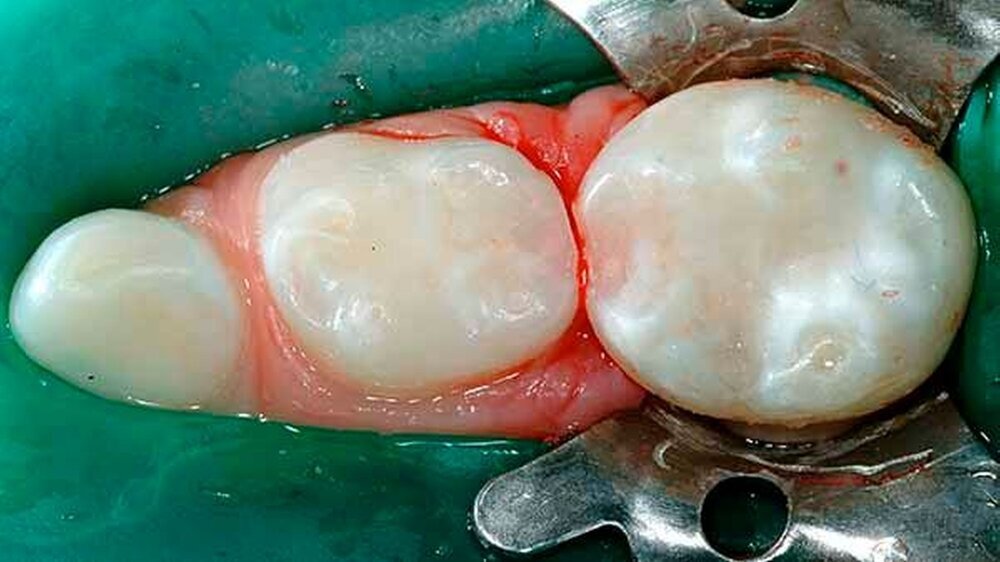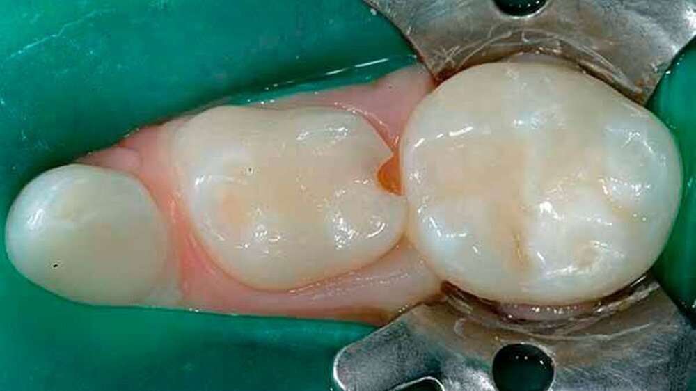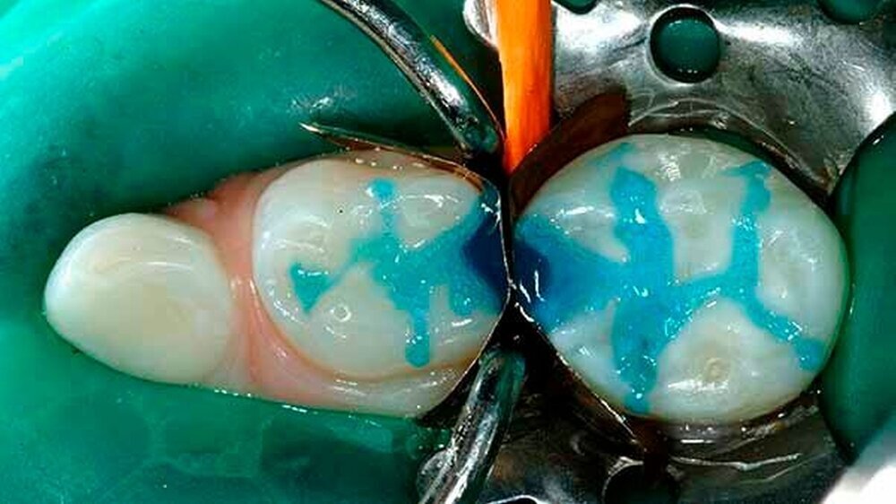 Vorteilhaft ist es jedoch, der Verwendung des Einflaschensystems eine selektive Schmelzätzung mit Phosphorsäure voranzustellen [Krämer et al., 2014]. Eine gewissenhafte Trockenlegung der Kavität ist bei der Verwendung von Kompositen im Milchgebiss eine wichtige Voraussetzung. Dabei ist eine relative Trockenlegung das übliche Verfahren. Dies kann etwa durch die Verwendung eines in der Kinderzahnheilkunde üblichen Langloch-Kofferdams erreicht werden. Dafür werden immer mehrere Zähne durch einen längeren Schnitt im Kofferdam isoliert. Die Verwendung eines geeigneten Matrizensystems und Keils ist auch im Milchgebiss sowohl zur zervikalen Abdichtung der Kavität als auch für eine gute Formgebung der Füllung angezeigt.