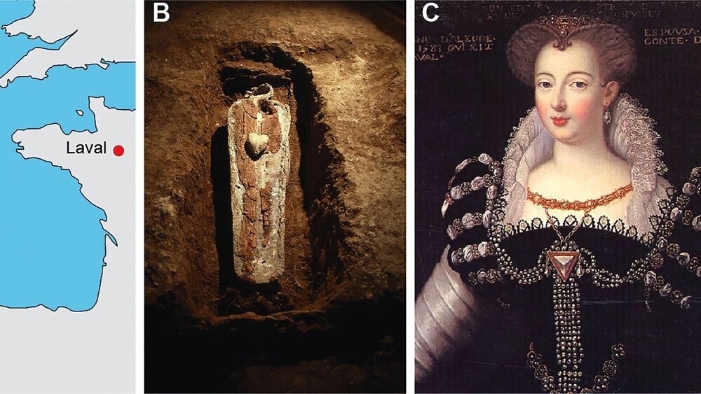 Die Leiche der vor 400 Jahren verstorbenen Adeligen Anne d'Alègre wurde 1988 bei einer archäologischen Ausgrabung im Chateau de Laval im Nordwesten Frankreichs gefunden. Ihr in einem Bleisarg einbalsamiertes Skelett - und ihre Zähne - waren bemerkenswert gut erhalten. Damals stellten die Archäologen fest, dass sie eine Zahnprothese trug, viel mehr konnten sie anhand der damals verfügbaren Methoden leider nicht herausfinden.