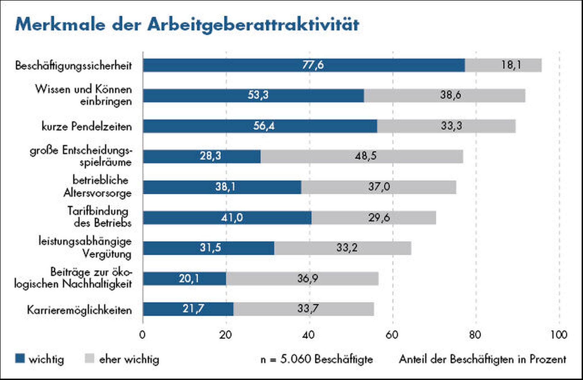Wichtig sind demnach für 90 Prozent der Befragten ein sicherer Job, das eigene Wissen und Können voll einbringen zu können und ein kurzer Weg zum Betrieb.