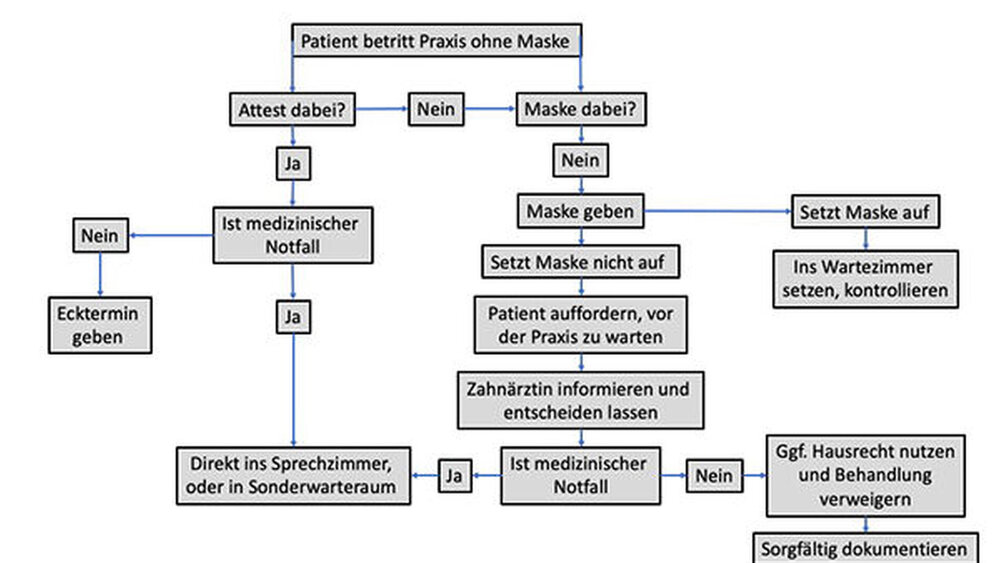 In dieser Gemengelage ist es für das Team hilfreich, wenn das in der Praxis gewünschte Vorgehen im Umgang mit Patientinnen ohne Maske komplett durchgesprochen wird. Dadurch entsteht Sicherheit und die Zahnärztin wird danach so selten wie möglich in der Behandlung unterbrochen. Ein mögliches strukturiertes Vorgehen ist in der Grafik kurz dargestellt: