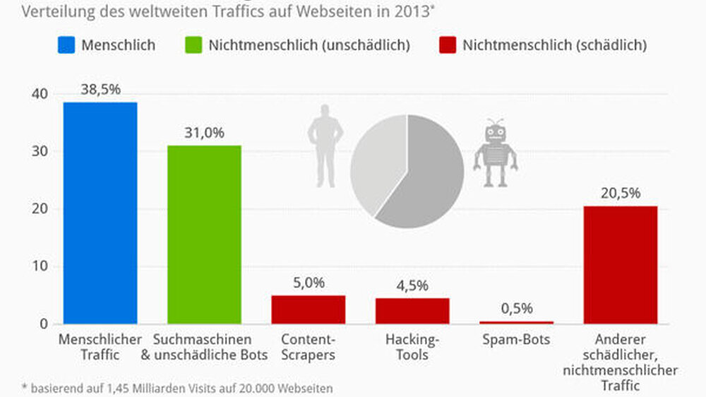 Nach der Analyse von Incapsula handelt es sich nur bei 38,5 Prozent um "menschlichen Traffic". Dagegen entfielen 31 Prozent auf Suchmaschinen-Bots, 5 Prozent auf Content-Scrapers, die fremde Inhalte extrahieren und auf eine Seite kopieren, und 0,5 Prozent auf Spammer.