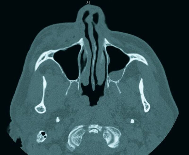 Eine 71-jährige Patientin im Zustand nach endodontischer Behandlung am Zahn 23 alio loco wurde in unserer Klinik vorstellig. Nach Spülung des Wurzelkanals mit Natriumhypochlorit beim Hauszahnarzt wurde die Behandlung aufgrund einer eintretenden Schwellung im Bereich der Oberlippen beidseits abgebrochen. In unserer Klinik wurde ein Weichteilhämatom im Bereich der Nasolabialfalte und des Mentums links diagnostiziert, sowie eine Ausbreitung des Weichteilemphysems entlang der perioralen Muskulatur ausgehend vom Zahn 23 nach submental und bukkal.