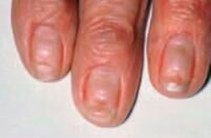 Bei Autoimmunerkrankungen wie Lupus erythematodes und Dermatomyositis findet sich oftmals eine rotviolette Verfärbung des proximalen Nagelfalzes mit ampullenarti- gen Teleangiektasien, die oft druckschmerzhaft sind. Gelegentlich zeigt auch das Nagelbett eine rötlich-bläuliche Verfärbung. An der Nagelplatte können Störungen wie Streifen oder abnorme Brüchigkeit hinzukommen.