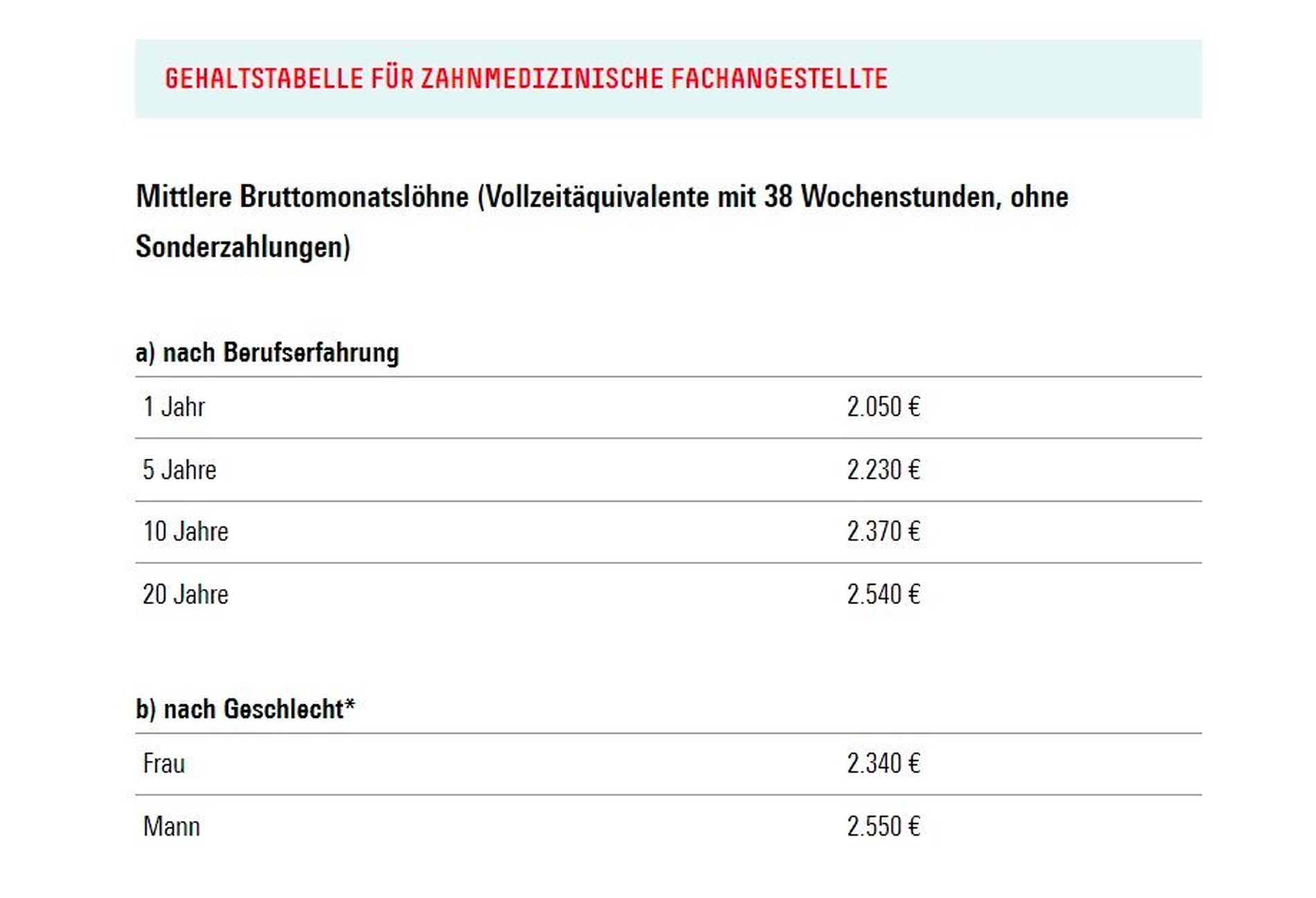 Ein neues Tool bietet zudem detaillierte Gehaltsdaten für mehr als 100 Berufe an – darunter für ZFA sowie Zahntechnikerinnen und Zahntechniker. Die Auswertung „Wer verdient was?“ differenziert nach Bundesland, Geschlecht und Berufserfahrung und weist die jeweils üblichen Gehälter detailliert aus.