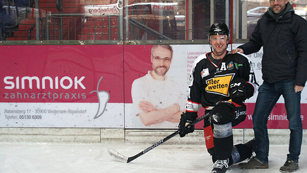 Ausnahme: die 4m x 1m große Bande im Eishockey-Stadion in Bissendorf. Vor knapp zehn Jahren, im Januar 2009, ließ sich Simniok in unmittelbarer Nähe nieder - nur zwei Kilometer Luftlinie trennen Stadion und Praxis. "Im Übrigen habe ich als Kind in dieser Eishalle selber Schlittschuhlaufen gelernt", verrät der Zahnarzt. Und sogar als Mitglied einer Amateurtruppe stand er selber mit dem Schläger auf dem Eis. "Leider lässt sich die Arbeit als Zahnarzt nur unzureichend mit den gesundheitlichen Risiken des Eishockeys vereinbaren. Und somit musste ich meine Karriere schnell wieder beenden", lacht Simniok.