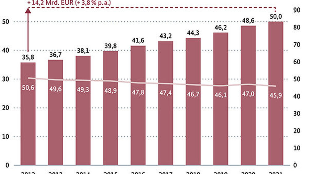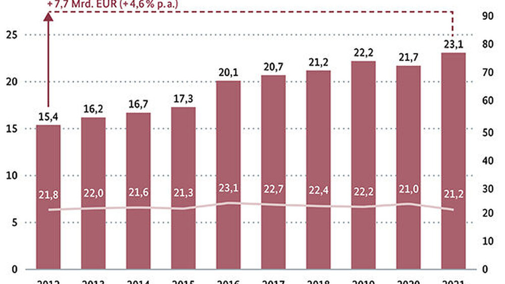 Die Gesundheitswirtschaft ist in den vergangenen zehn Jahren mit Ausnahme des Pandemiejahres 2020 kontinuierlich gewachsen. Das geht aus dem neuen Bericht des Bundeswirtschaftsministeriums zur Gesundheitlichen Gesamtrechnung 2021 hervor. 2021 erbrachte die Branche demnach 391,8 Milliarden Euro an Wertschöpfung. Das entspricht 12,1 Prozent der Bruttowertschöpfung in Deutschland. Davon werden 23,1 Milliarden Euro Bruttowertschöpfung durch Zahnarztpraxen generiert.