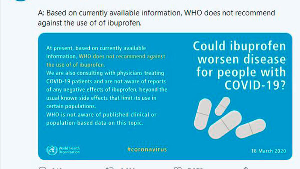 Die Warnung fußte auf Beobachtungen von behandelnden Ärzten, die eine Verschlechterung nach der Einnahme bei Patienten mit schweren Covid-19-Verläufen feststellten und bei Rückschlüssen unter anderem den Einfluss der Arznei hierbei hinterfragen. Obwohl keine Belege für einen Zusammenhang vorlagen, riet die WHO sicherheitshalber, auf Paracetamol zurückzugreifen.