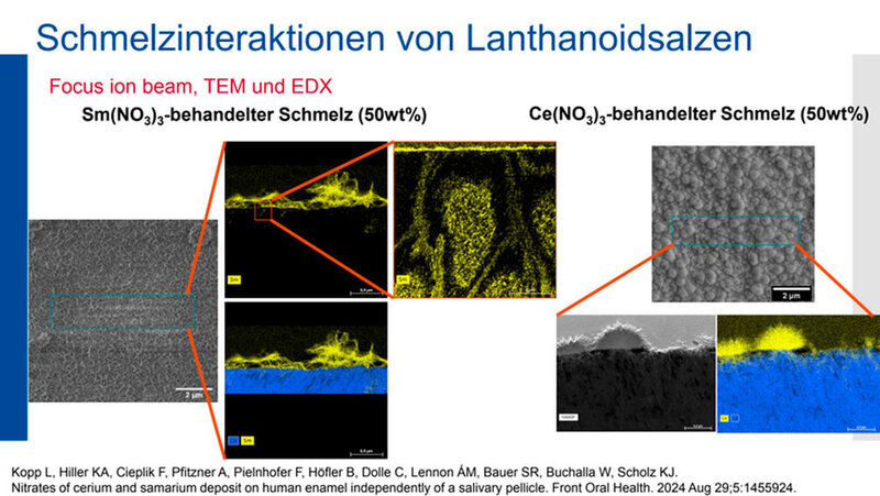 Eine neue Möglichkeit des Oberflächenschutzes stellte Priv.-Doz. Dr. Konstantin J. Scholz (Freiburg) vor: Bestimmte Salze von Seltenerdmetallen, sogenannte Lanthanoid-Salze, können stabile Schutzschichten bilden und die darunter liegende Zahnhartsubstanz schützen. Diese Salze könnten möglicherweise eines Tages eine Alternative oder Ergänzung zu Fluoriden bilden.