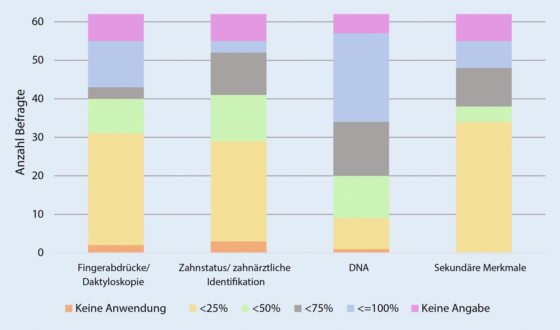 Ergebnisse: In 72,6 Prozent der Fälle werden bei der Identifizierung verschiedene Merkmale kombiniert, am häufigsten DNA mit Zahnstatus (37,1 Prozent). Die DNA-Analyse wird am häufigsten verwendet. Laut 62,9 Prozent der Befragten wird die zahnärztliche Identifizierung „oft“ angewendet. Der Anteil der Identifizierung allein mittels Zahnstatus wird auf 1,6 bis 8,1 Prozent geschätzt. Für die forensische Zahnmedizin haben 19,4 Prozent eine feste Ansprechperson. Eine digitale Plattform, um Zahnmediziner zu kontaktieren, schätzten 56,5 Prozent als hilfreich ein.