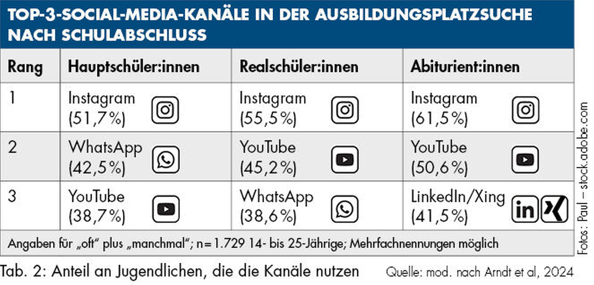 Insgesamt betrachtet nehme Social Media aber bei allen Jugendlichen in ihrem Alltag viel Raum ein, weshalb man sie auch sehr gut über dieses Format erreichen könne. Allerdings zeige sich auch hier, dass ein genauer Blick auf das Suchverhalten der jeweiligen Zielgruppe wichtig ist, weil junge Menschen mit niedrigem Schulabschluss eben über andere Social-Media-Kanäle gehen als die mit höherem Schulabschluss. So könne man Jugendliche mit Haupt- oder Realschulabschluss neben Instagram besonders gut über WhatsApp und YouTube erreichen. Abiturientinnen und Abiturienten dagegen suchten noch stärker auf YouTube und zudem auf LinkedIn und Xing nach Ausbildungsplätzen.