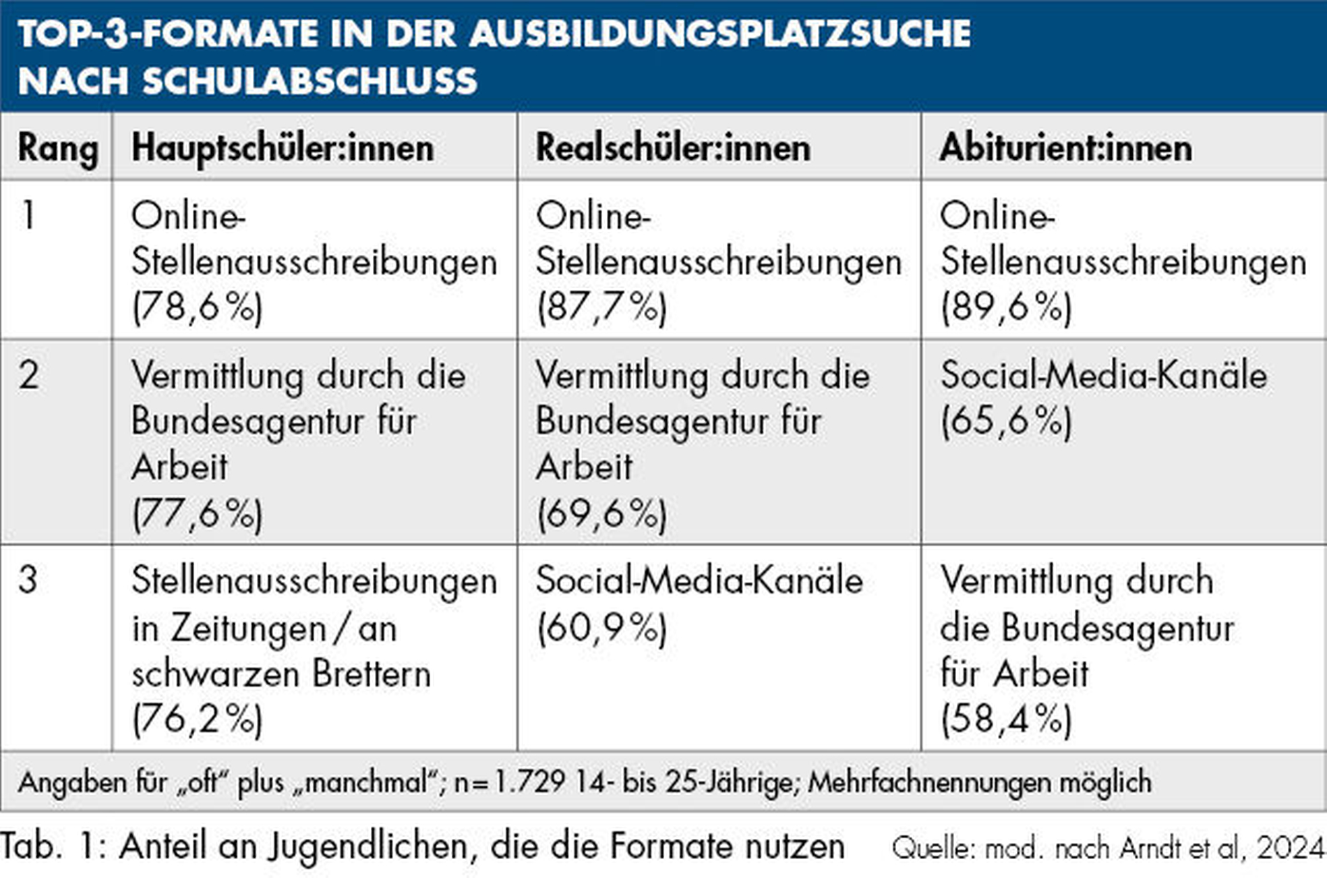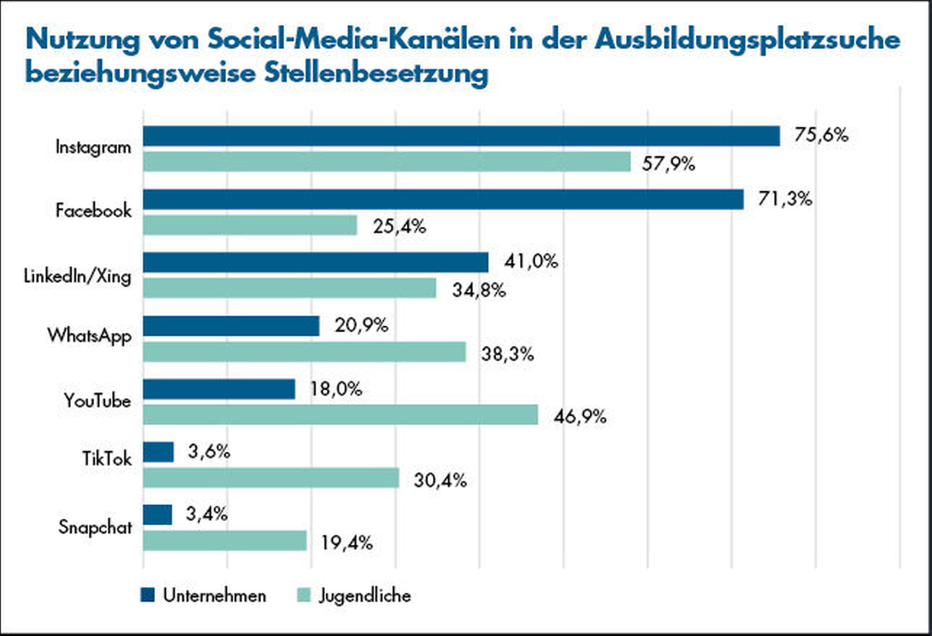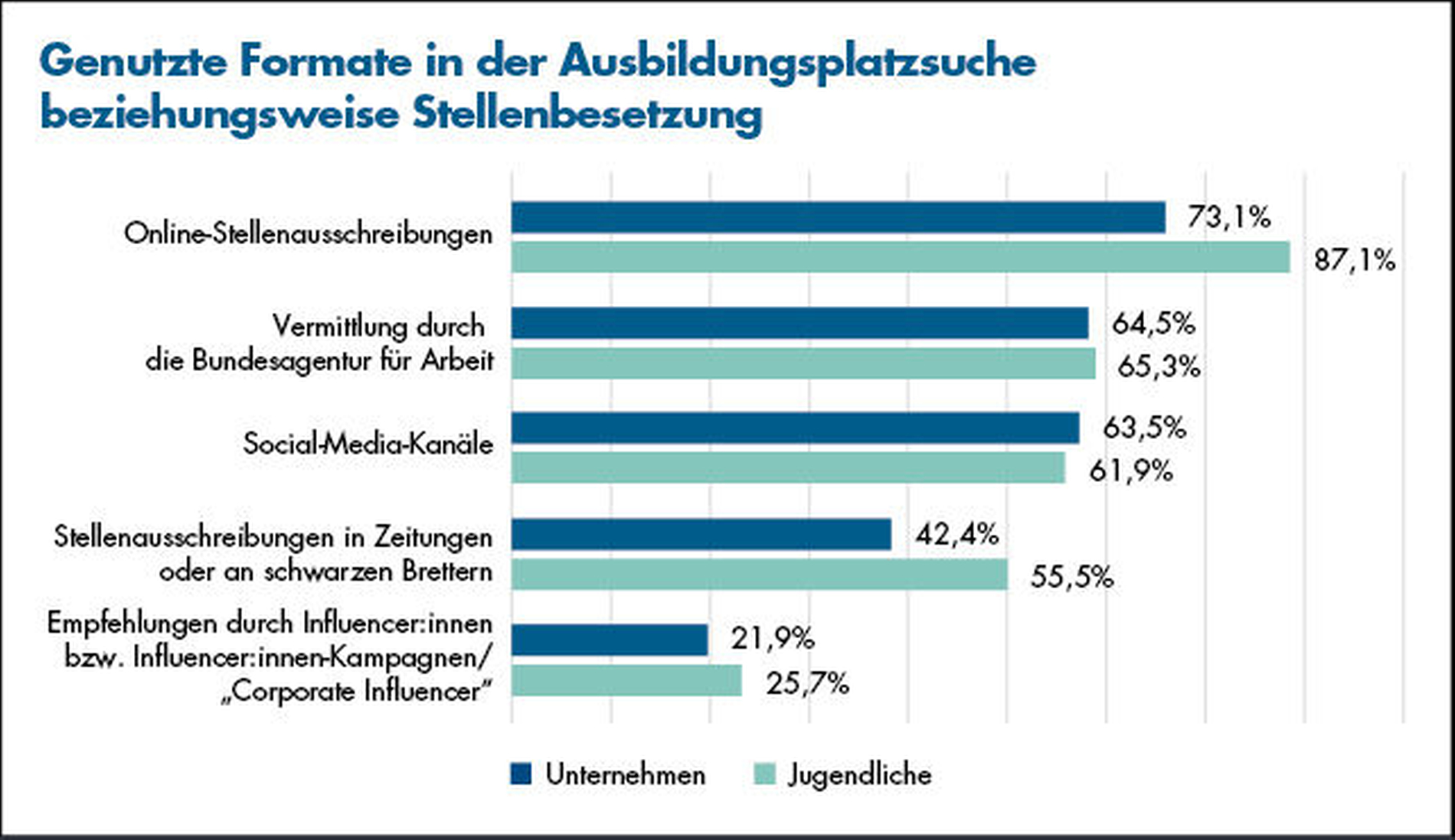 „Grundsätzlich passen die Suchstrategien von Jugendlichen und Unternehmen gut zueinander, wenn man die Wahl der Suchformate vergleicht“, heißt es in der Studie: Neben Online-Stellenanzeigen seien die Vermittlung durch die Bundesagentur für Arbeit und Social Media die wichtigsten Formate am Ausbildungsmarkt. Bei einem genauen Blick zeige sich jedoch, dass die Betriebe und die Jugendlichen teilweise auf unterschiedlichen Social-Media-Kanälen unterwegs sind.