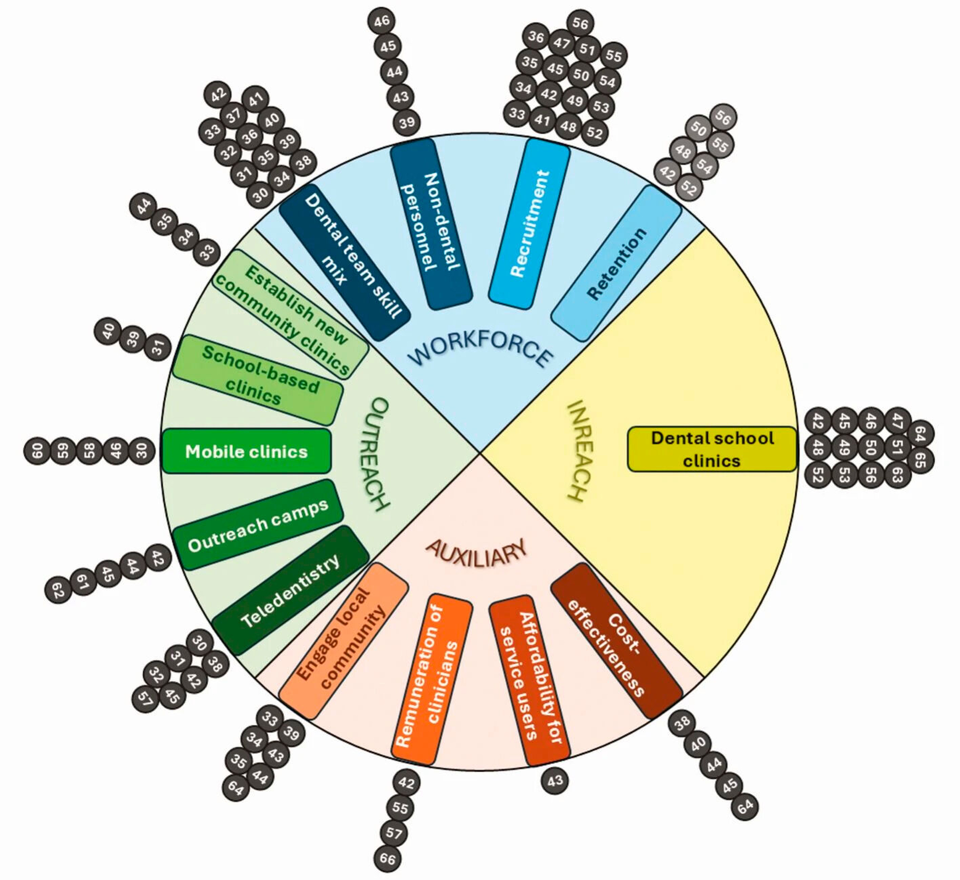 Der Schwerpunkt der Maßnahmen betraf das Personal (Kompetenzmix des zahnärztlichen Teams und des nicht-zahnärztlichen Personals, Strategien zur Rekrutierung und Bindung), die Öffentlichkeitsarbeit (Telezahnmedizin; mobile, aufsuchende und schulbasierte Dienste; neue Gemeindesprechstunden), In-Reach (Schulsprechstunden) und zusätzlichen Zugangsinitiativen (Einbeziehung der örtlichen Gemeinde, erschwingliche Versorgung, Kosteneffizienz und Vergütung des Klinikpersonals). Alle Interventionen schienen den Zugang zur Versorgung zu ermöglichen.