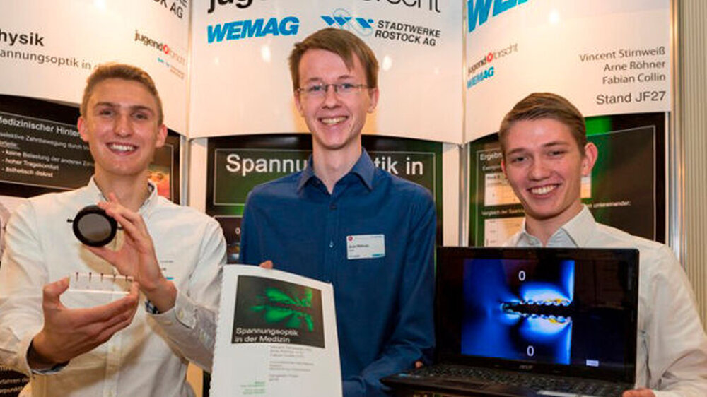Vincent Stirnweiß, Arne Röhner und Fabian Röhner:Nun, gerade mit den Minischrauben gibt es bei der Implantatversorgung immer wieder Probleme. Entweder die Schrauben brechen ab oder sie bringen die Knochen zum Absterben - beides aufgrund einer zu hohen Spannung im Kiefer. Wie genau diese Spannung errechnet wird, das haben wir aufwendig dargestellt und sind Landessieger "Jugend forscht" im Fachgebiet Physik geworden.
