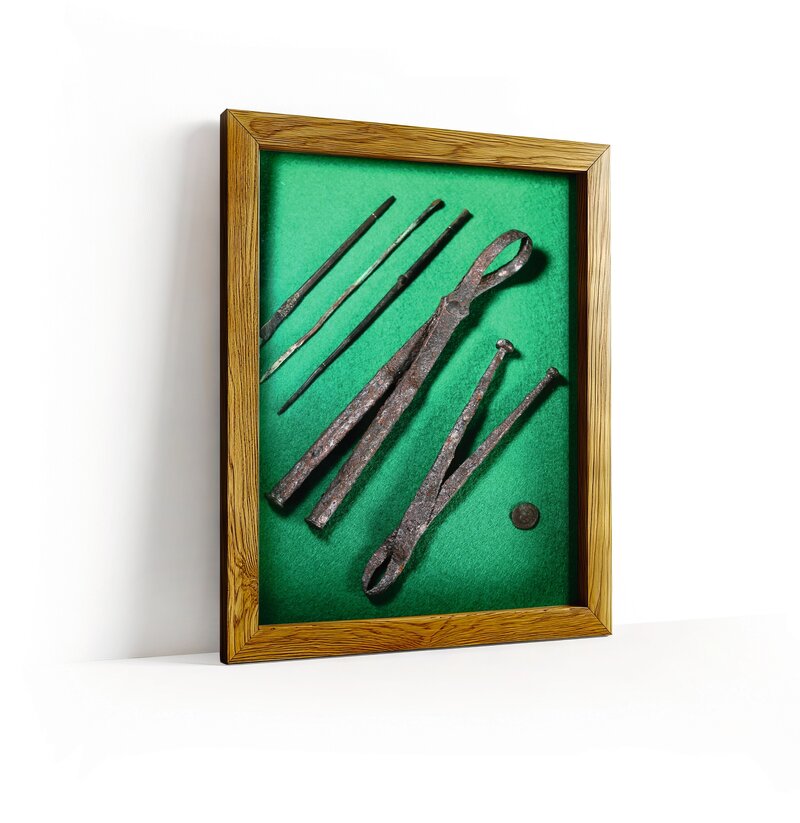 Bei den turnusmäßigen Treffen des „Arbeitskreis Geschichte in der Zahnheilkunde“ hat immer mal wieder die eine oder der andere einen kleinen Schatz aus dem privaten Archiv mitgebracht. Eines Tages wollte auch Dr. Claus Simon die KollegInnen überraschen: Bei ihm im Büro in seiner Praxis hing – geschützt durch eine Sicherheitsanlage – seit den 1980er-Jahren dieser Schaukasten mit den zwei Extraktionszangen aus der Zeit Kaiser Konstantins, also gegen 300plus nach Christi.