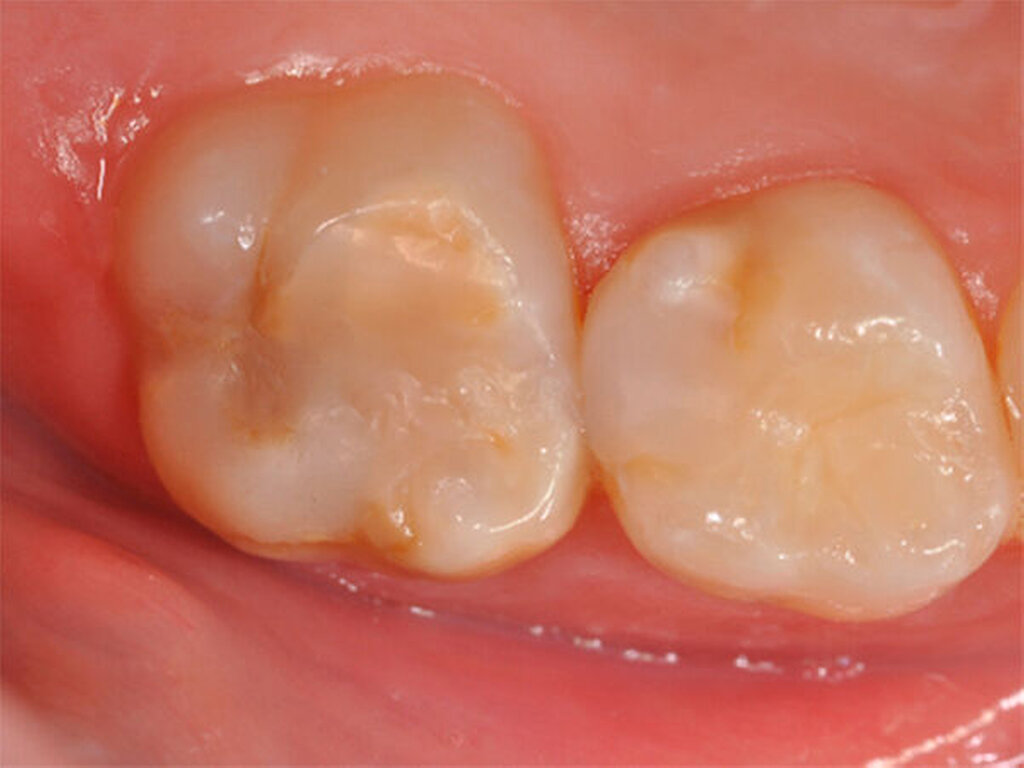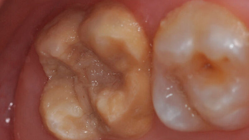 Milde Form der MIH. Verfärbungen, die auf den weichen MIH-Schmelz hinweisen, sind auf der Kaufläche des Backenzahnes zu erkennen. Ein wichtiges Charakteristikum des Schmelzes ist die um Faktor 10 reduzierte Härte, so dass mit Karies und Einbruch der Oberfläche unter Kaubelastung gerechnet werden muss. |
