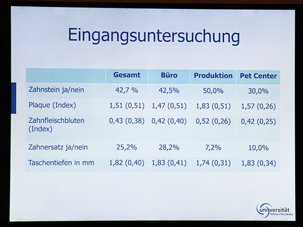 Anschließend berichtete Zimmer von den ersten Ergebnissen eines Pilotprojekts zur betrieblichen zahnmedizinischen Prävention, das im Mai 2018 in einem Unternehmen der Tierfutterindustrie startete. Ziel des gemeinsamen Pilotprojekts der Universität Witten/Herdecke und der Firma Wirgley ist es, die Umsetzbarkeit und die Wirksamkeit eines niedrigschwelligen Präventionsangebots zu untersuchen. Die Laufzeit für die Studie beträgt ein Jahr.