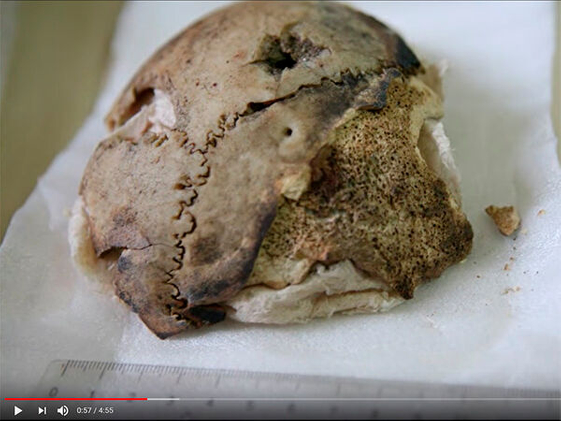 Schwieriger waren die Untersuchungen des verkohlte Schädelfragments, das in einer Plastikbox für Computerdisketten aufbewahrt wurde. Dabei handelte es sich um ein Stück der oberen Schädeldecke, in dessen Mitte ein großes Loch klaffte. Anhand der Kraterbildung hielt Benecke dieses Loch für das Austrittsloch eines Projektils.
