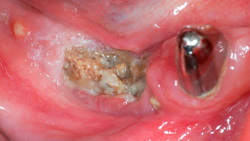 „Es beginnt mit Schmerzen und Schwellungen im Bereich des Kieferkammes“, berichtet Ehrenfeld. „Daraus können sich Abszesse und Fisteln bilden, aus denen Sekrete, beispielsweise Eiter, fließen.“ Eine Röntgenaufnahme zeigt dann, dass Teile des Knochens abgestorben sind. Eine solche Osteonekrose des Kiefers wurde erstmals 2003 als seltene Komplikation nach der Behandlung mit Bisphosphonaten beschrieben. Die Komplikation tritt auch nach der Behandlung mit dem Wirkstoff Denosumab auf.