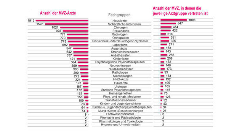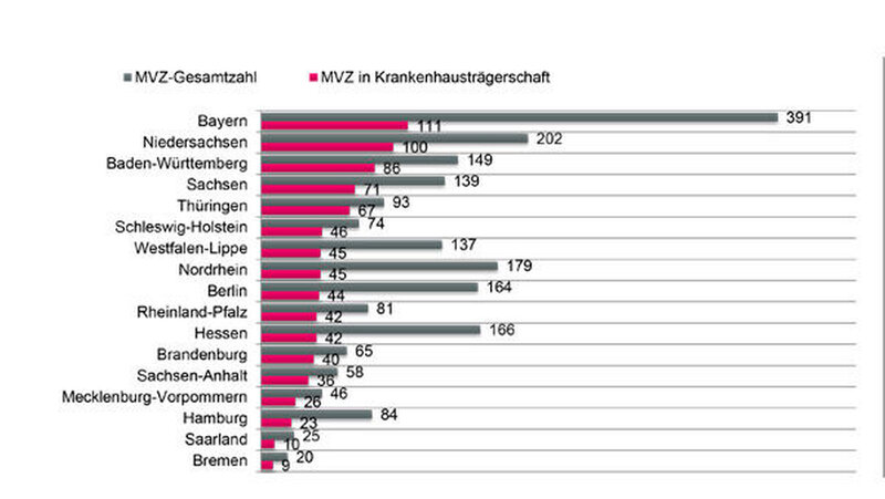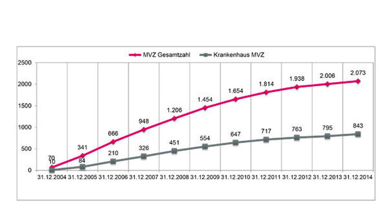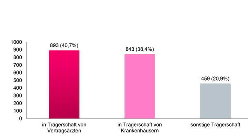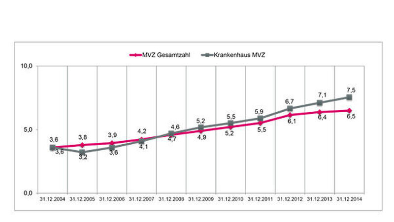 Bei 843 MVZ ist ein Krankenhaus als Träger beteiligt, das sind 48 mehr als vor einem Jahr und entspricht einem Anteil von 38,4 Prozent. Rund 40 Prozent der MVZ sind in der Hand von Vertragsärzten, weitere rund 21 Prozent haben weitere Träger. MVZ, die in Trägerschaft eines Krankenhauses stehen, arbeiten nahezu ausschließlich mit angestellten Ärzten. Durchschnittlich arbeiten in einem MVZ 6,5 Ärzte.