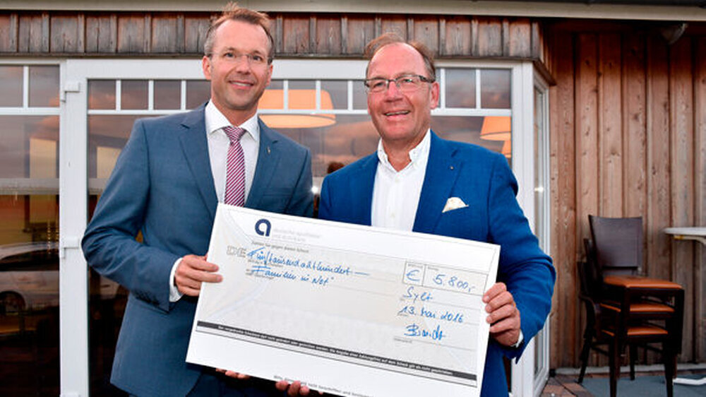 Dr. Michael Brandt, Präsident der Zahnärztekammer Schleswig-Holstein, überreichte den Scheck dem Bürgermeister der Gemeinde Sylt, Nikolas Häckel.