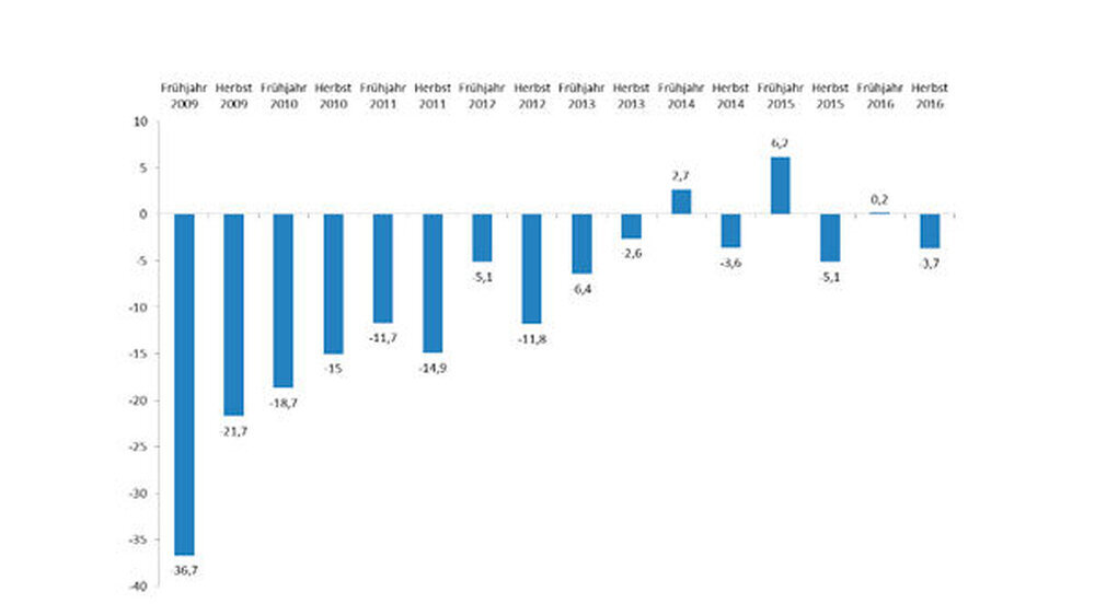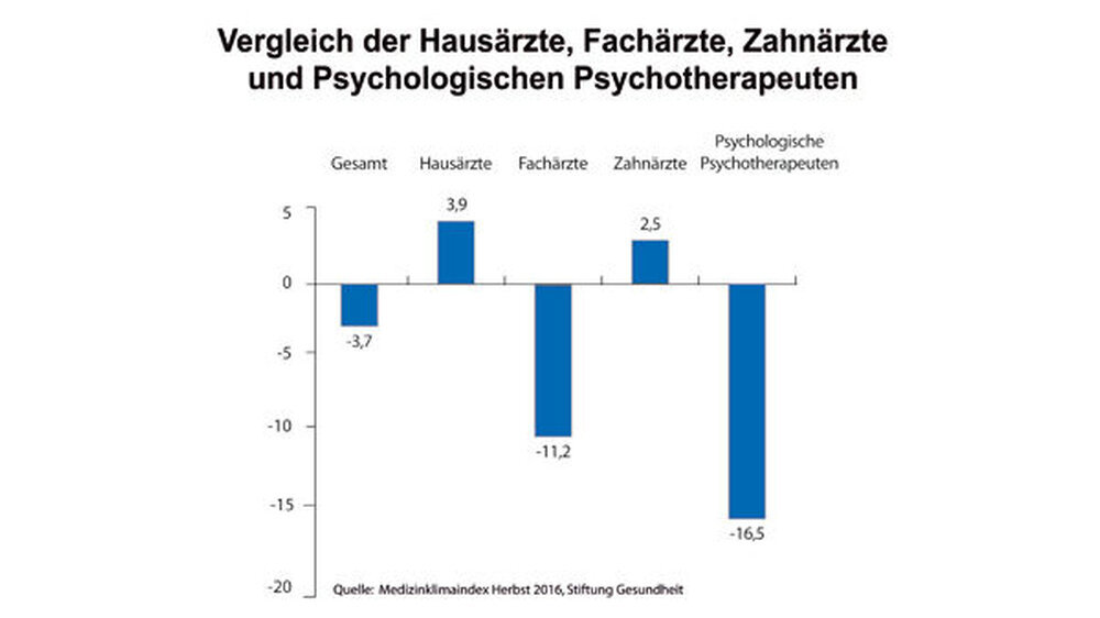 Die Psychologischen Psychotherapeuten schauen im Vergleich zum Frühjahr 2016 (-10,5) ebenfalls noch pessimistischer in die Zukunft: 22,2 Prozent nennen ihre aktuelle wirtschaftliche Lage gut, 55,6 Prozent befriedigend, und 22,2 Prozent stufen die aktuelle Situation als schlecht ein. Der Medizinklimaindex der Psychologischen Psychotherapeuten liegt bei 16,7. Insgesamt ist der Medizinklimaindex im Herbst wieder ins Negative abgerutscht: Der Gesamtwert liegt aktuell bei -3,7. Im Frühjahr 2016 lag er bei +0,2.