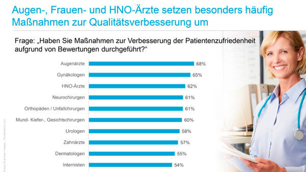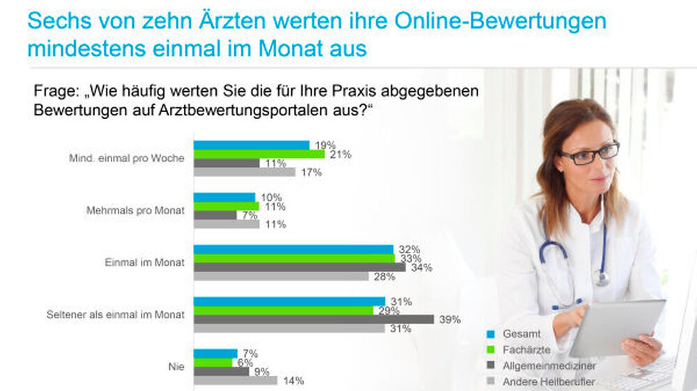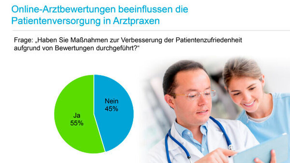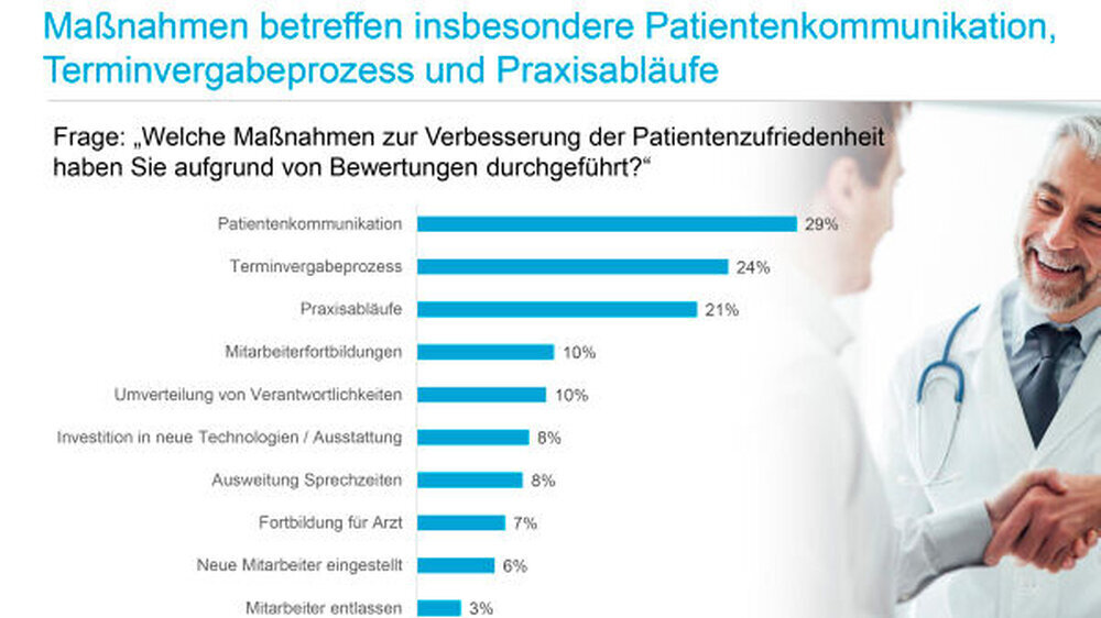 Außerdem gab jeder zehnte Befragte an, aufgrund von Online-Bewertungen Schulungen für das Praxispersonal durchgeführt zu haben. Fast genauso viele haben Mitarbeiterverantwortlichkeiten umverteilt. Sechs Prozent der Ärzte stellten aufgrund des Feedbacks von Patienten weitere Mitarbeiter ein. Bei drei Prozent führten Bewertungen zum genauen Gegenteil: Sie entließen aufgrund des Feedbacks auf Arztbewertungsportalen Mitarbeiter.