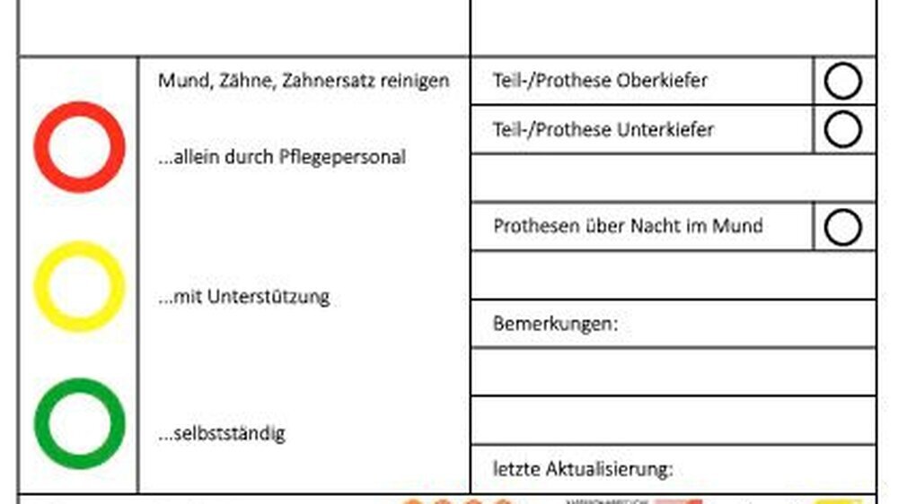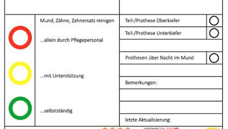 Um die alltägliche Mundpflege in den Pflegeeinrichtungen in Berlin zu erleichtern, haben die Zahnärztekammer Berlin und die KZV Berlin in Zusammenarbeit mit der Deutschen Gesellschaft für Alterszahnheilkunde (DGAZ) eine Mundhygiene-Pflege-Ampel herausgebracht. Die kompakte, mehrfach beschrift- und ablösbare Haftfolie in DIN A6 für den Badezimmerspiegel ist ein individualisierbarer Mundhygiene-Pflegeplan nach Torben Wenz, einem Zahnarzt aus Pforzheim. Sie ermöglicht dem Pflegepersonal das einfache Dokumentieren und Umsetzen von spezifischen Mundhygieneplänen der zu Pflegenden.