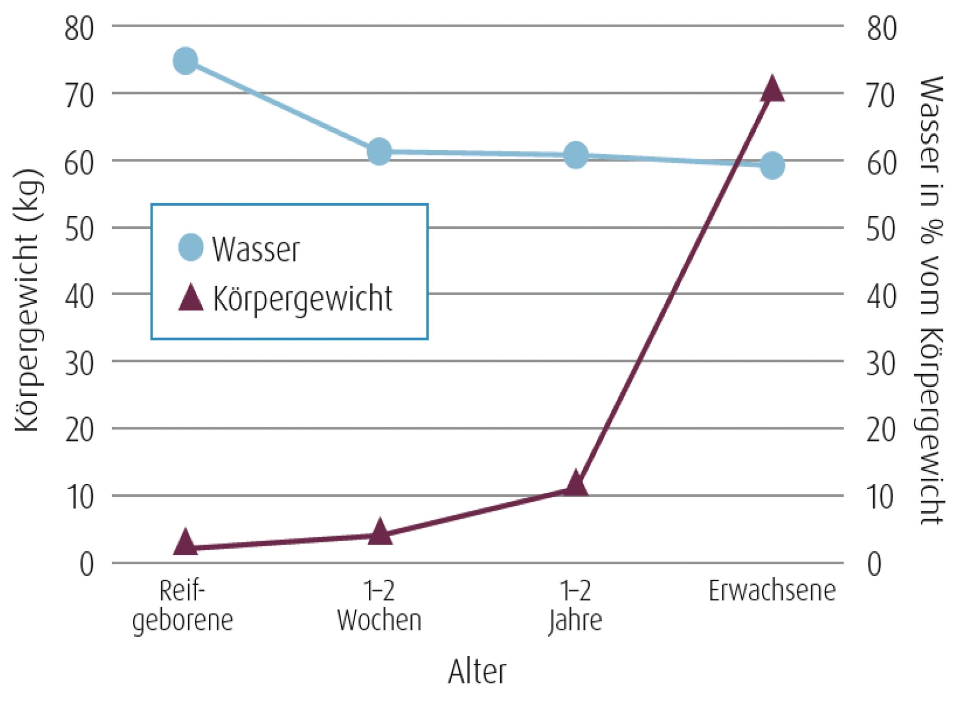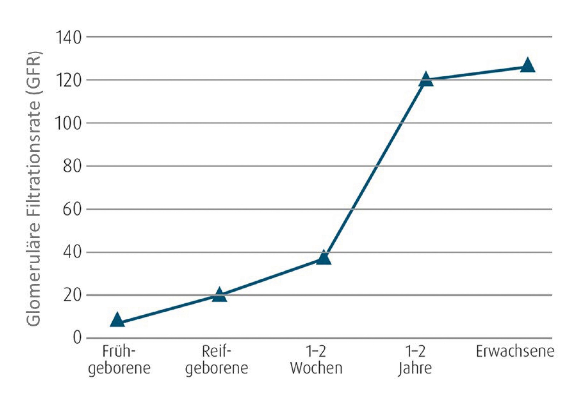 So ist die glomeruläre Filtrationsrate (GFR), die die relevante Funktion der Nieren für die Ausscheidung von Arzneimitteln darstellt, bei Säuglingen gegenüber Erwachsenen deutlich reduziert (Abbildung 1). Dadurch ist die Elimination über die Niere verlangsamt und es kann zu einer längeren Verweildauer von Arzneistoffen im Körper kommen. Andererseits haben Säuglinge in Relation zum Körpergewicht ein wesentlich höheres Extrazellularvolumen und einen höheren Körperwasseranteil als Erwachsene (Abbildung 2). Dies bedingt ein höheres Verteilungsvolumen aller wasserlöslichen Arzneistoffe [Ude und Burkhardt, 2020].