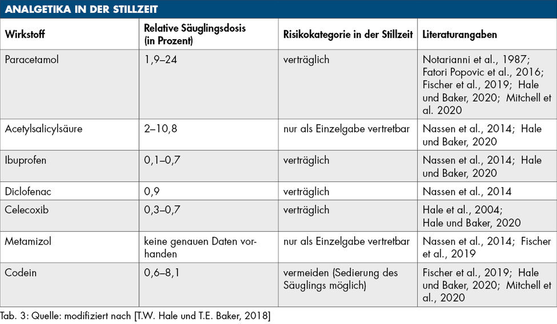 Unter den nichtsteroidalen Antirheumatika (NSAR) ist Ibuprofen während der Stillzeit das Mittel der Wahl [Horn und Kirch, 2000]. Aufgrund der hohen mütterlichen Plasmaeiweißbindung (> 99 Prozent) und der geringen Lipidlöslichkeit geht nur ein sehr geringer Anteil in die Muttermilch über (Tabelle 3) [Nassen et al., 2014; Hale und Baker, 2018; Fischer et al., 2020; Ude und Burkhardt, 2020].