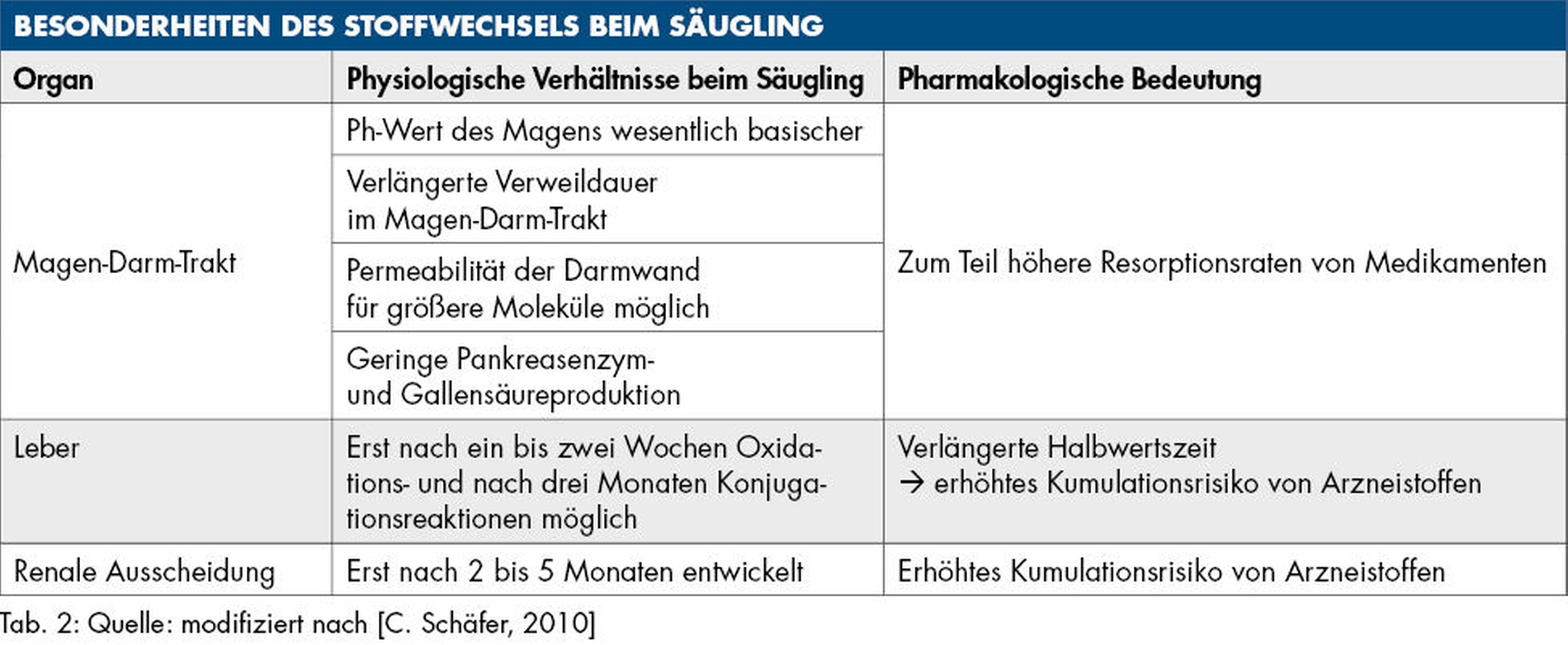 Die wichtigsten pharmakologisch relevanten Stoffwechseländerungen dieser Lebensphase sind in Tabelle 2 zusammengefasst. Typisch für Neugeborene und Säuglinge sind die Besonderheiten des Magen-Darm-Trakts und die unvollständigen hepatischen und renalen Eliminationsmechanismen in den ersten Lebensmonaten. Dies kann insgesamt zu erheblichen Verzögerungen bei der Wirkstoffelimination führen [Ude und Burkhardt, 2020].