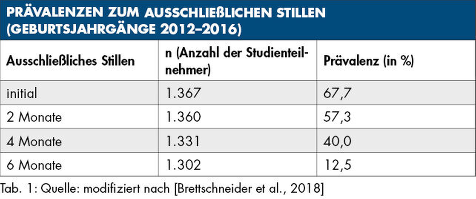 Die Daten der repräsentativen „Studie zur Gesundheit von Kindern und Jugendlichen in Deutschland“ (KiGGS) zeigen, dass nur sehr wenige Kinder bis zum sechsten Lebensmonat ausschließlich gestillt werden (Tabelle 1). Die mittlere Stilldauer für ausschließliches Stillen lag in der Untersuchungsgruppe der Geburtsjahrgänge 2012 bis 2016 bei 3,9 Monaten [Brettschneider et al., 2018]. Allerdings beendet knapp ein Viertel aller Frauen das Stillen aufgrund einer Medikamenteneinnahme [Gupta und Dadhich, 2007]. Die durchschnittliche Stilldauer (jegliches Stillen) beträgt seit Langem etwa acht Monate [Robert Koch-Institut, 2020].