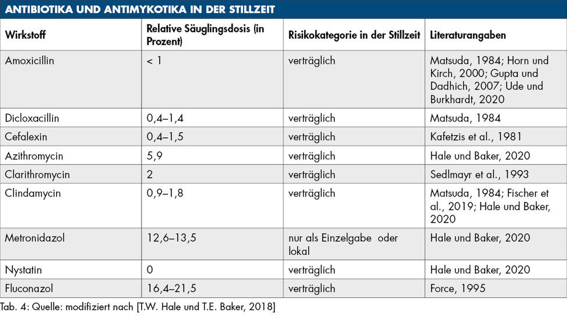 Die Penicillinderivate als gebräuchlichste Gruppe wie auch die Cephalosporine bleiben aufgrund ihrer hohen Polarität weitestgehend aus dem Milchkompartiment ausgeschlossen und die RID-Werte sind entsprechend niedrig (Tabelle 4) [Hale und Baker, 2020]. Mittel der zweiten Wahl sind Makrolide, die allerdings bei einem bestehenden Ikterus des Neugeborenen nicht angewendet werden sollten [Horn und Kirch, 2000; Ude und Burkhardt, 2020]. Clindamycin wird aufgrund der etwas höheren Wahrscheinlichkeit von kindlichen Stuhlveränderungen ebenfalls als Mittel der zweiten Wahl angesehen [Hale und Baker, 2020]. Laut Embryotox erfordern eine lokale Metronidazol-Therapie oder Einzelgaben keine Einschränkung des Stillens. Hale und Baker empfehlen hingegen, nach einer Einzelgabe die Milch für zwölf bis 24 Stunden zu verwerfen [Hale und Baker, 2020]. Die Indikation zur mehrtägigen oder intravenösen Therapie mit Metronidazol sollte in der Stillzeit kritisch gestellt werden.