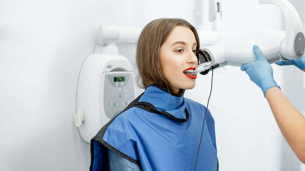 Panoramaschicht- und Fernröntgenaufnahme: Patientenschutzschürze (am Hals anschließend und den Rücken schützend)
