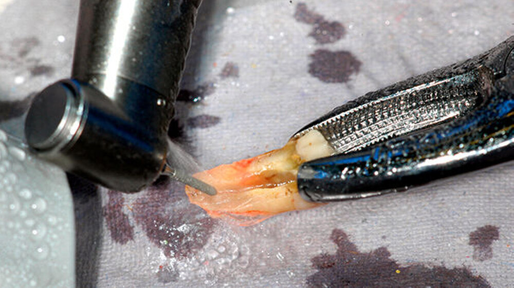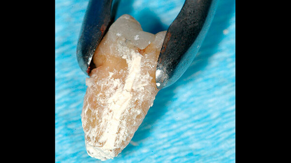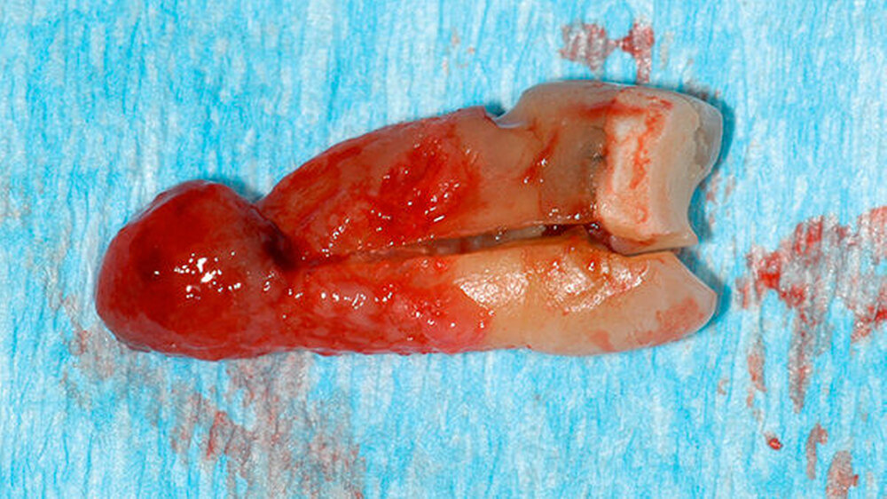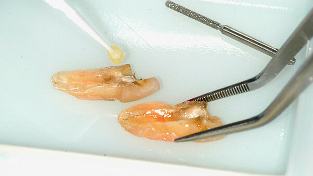 Nachdem die Patientin darüber aufgeklärt wurde, wie der Zahn möglicherweise erhalten werden kann, wurden die Zahnfragmente nach Gabe einer Infiltrationsanästhesie schonend extrahiert (Abbildung 3). Nach der Extraktion wurden die zwei Zahnfragmente zunächst in der Zellnährlösung einer Zahnrettungsbox (Medice Pharma, Iserlohn) geschwenkt, um sie von Blut und Gewebe zu säubern. Das apikale Granulationsgewebe, das bei der Extraktion an der Wurzelspitze verblieben war, konnte manuell mit einer Luer Zange entfernt werden.