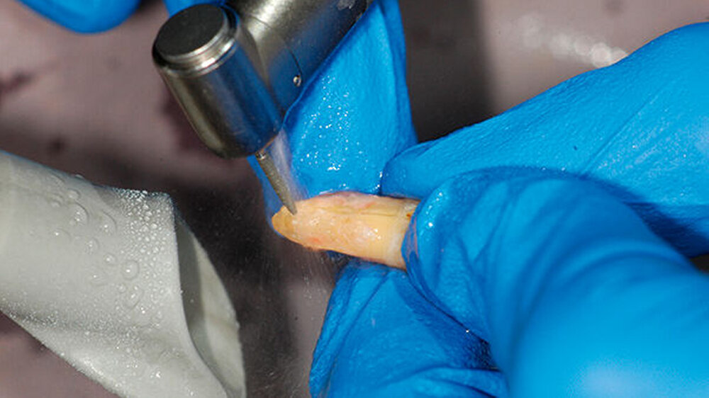 Danach wurden die Wurzelkanalwände des jeweiligen Fragments mit einem diamantierten torpedoförmigen Schleifkörper präpariert, wobei die Frakturflächen nicht berührt wurden (Abbildung 4). Auf die beiden Frakturflächen sowie die Wurzelkanalwände wurde anschließend ein selbstätzender All-In-One Dentinhaftvermittler (Optibond All-In-One; Kerr, Orange, USA) appliziert und die zwei Fragmente mithilfe eines dualhärtenden Komposits (Nexus NX 3; Kerr) adhäsiv zusammengesetzt (Abbildung 5).