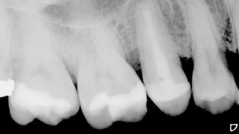 Das röntgenologische Kontrollbild zeigte nach sechs Monaten im Vergleich zur Ausgangssituation im Bereich der entfernten Wurzelspitze und der ehemaligen apikalen Aufhellung eine zunehmende knöcherne Regeneration (Abbildung 10). Zu diesem Zeitpunkt wurde entschieden, den Zahn mit einer Teilkrone zu versorgen, um Scherkräfte zwischen den beiden Höckerspitzen des Zahns zu vermeiden und das Risiko einer erneuten Fraktur zu minimieren. Die Ein-Jahres-Kontrolle zeigte einen konstant klinisch unauffälligen Zahn (Abbildung 11) und eine voranschreitende knöcherne Ausheilung im apikalen Bereich (Abbildung 12).