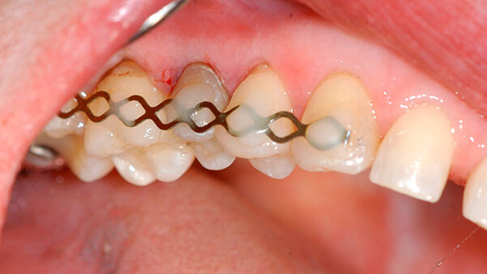 Die retrograde Präparation und der Frakturspalt wurden mit Biodentine aufgefüllt (Abbildung 7). Während des initialen Aushärtens des Zements wurde die restliche Wurzeloberfläche kontinuierlich mit der Nährlösung der Zahnrettungsbox versorgt. Nach etwa 15 Minuten Aushärtungszeit konnte der Zahn replantiert und im Anschluss für zehn Tage mit einer TTS-Schiene (TTS; Medartis, Basel) semirigide geschient werden (Abbildung 8). Kontrollen nach zehn Tagen, drei und sechs Monaten zeigten einen symptomlosen Zahn sowie eine unauffällige Perkussionsprobe ohne Anzeichen einer Ankylose und physiologische Taschensondierungstiefen von 3 mm (Abbildung 9).