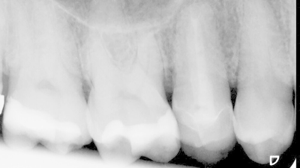 In der Poliklinik für Zahnerhaltung des Universitätsklinikums Münster war zwar die allgemeinmedizinische Anamnese unauffällig, doch zeigte sich klinisch nach Entfernung der vorhandenen mod-Glasionomerzementfüllung ein deutlicher Frakturspalt in mesial-distaler Ausrichtung am Boden der Kavität (Abbildung 1). Darüber hinaus war auf der Röntgenaufnahme des Vorbehandlers eine apikale Aufhellung zu erkennen (Abbildung 2).