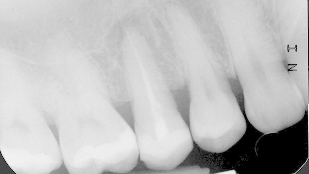 Aufgrund des Befundes war der Zahn nach aktueller Literaturlage als nicht erhaltungswürdig zu betrachten. Da die Patientin weder einem Implantat noch einer Brückenversorgung zustimmte, war bei der vorliegenden Situation eine Alternative erforderlich. Sie entschied sich nach der Aufklärung über die Behandlung und trotz der nicht vollständig abschätzbaren Prognose für den Versuch den Zahn zu erhalten.