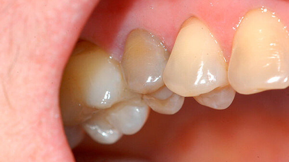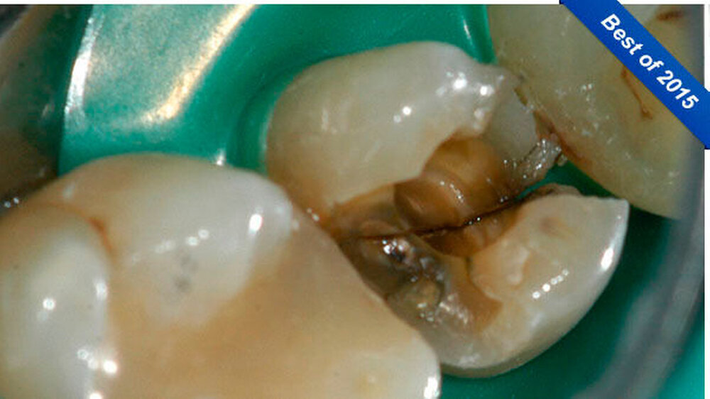 Für die komplikationslose Einheilung des Zahns ist - genau wie im vorhergegangenen Fallbeispiel - die Versorgung des Frakturspalts mit einem geeigneten Material obligat und der Schlüssel zum Erfolg. In beiden Fällen gelten die gleichen Grundgedanken. Erschwerend kam hinzu, dass bei der Patientin eine komplette Längsfraktur des Zahns vorlag. Da sich auch nach einem halben Jahr die Situation komplikationslos darstellte, wurde entschieden, den Zahn zu diesem Zeitpunkt mit einer Teilkrone zu versorgen, um das Risiko einer erneuten Fraktur durch auftretende Scherkräfte zwischen den beiden Höckern zu minimieren. Alternativ hätte man, um dieses Risiko von Beginn an zu reduzieren, auch kurz nach der initialen Behandlung eine Tabletop-Präparation mit vorübergehender Kompositversorgung anfertigen können.
