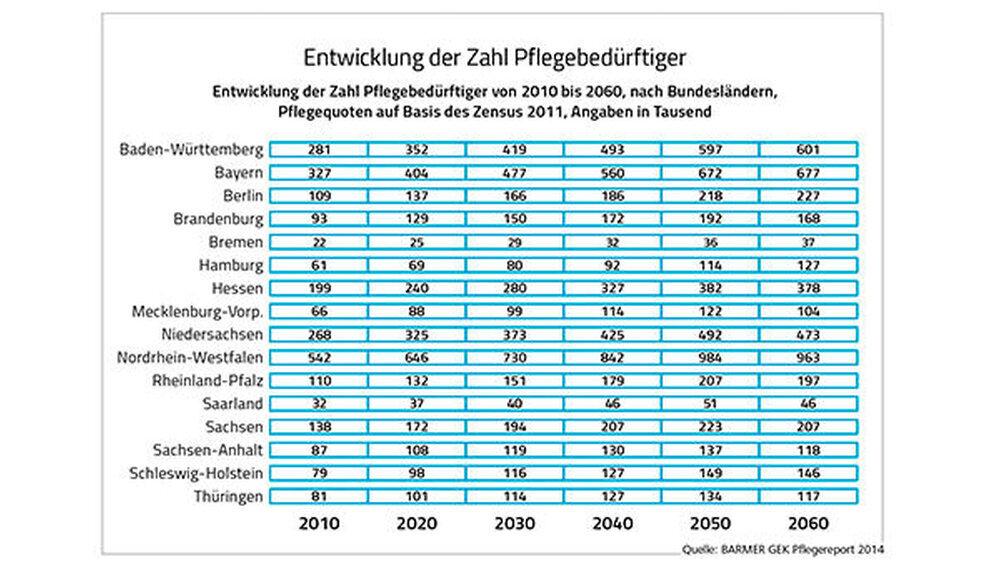 Die Prognosen seien je nach Region jedoch sehr unterschiedlich. Während sich die Zahl der Pflegebedürftigen in den Jahren 2010 bis 2050 in Sachsen-Anhalt um 57 Prozent erhöhen werde, liege diese Steigerungsrate in Baden- Württemberg knapp doppelt so hoch (113 Prozent), heißt es.