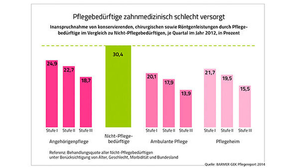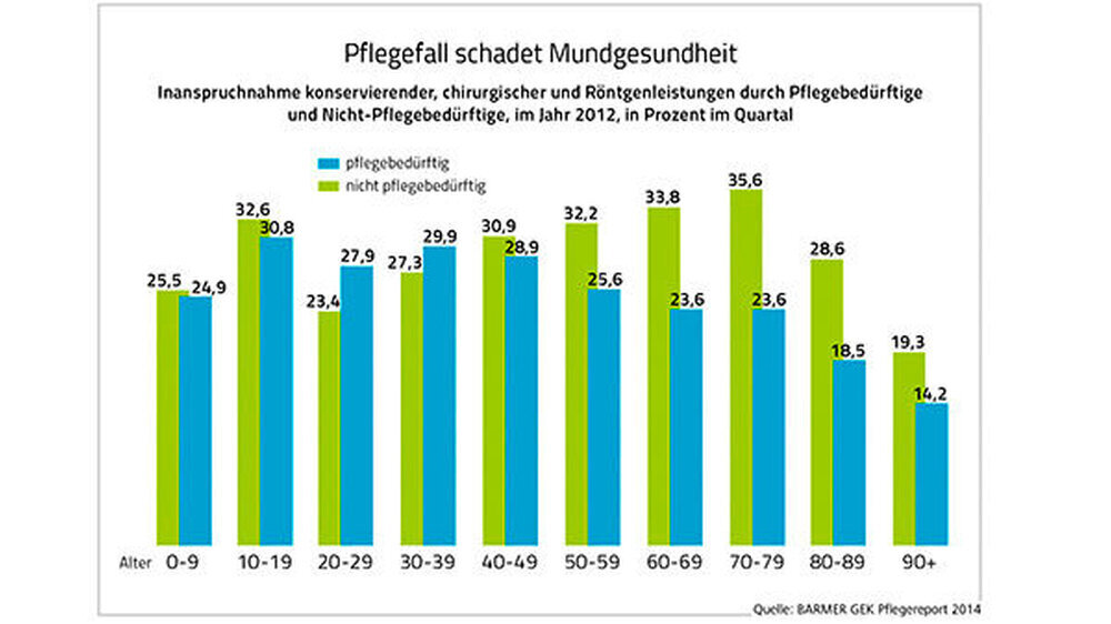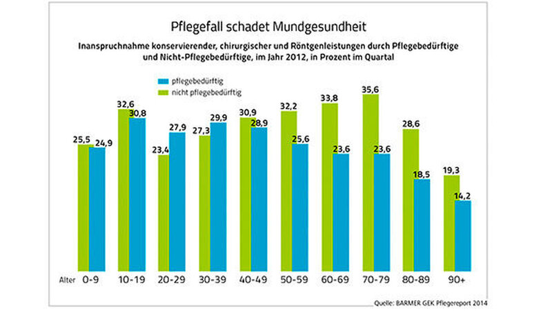 Der Pflegereport vergleicht demzufolge erstmals anhand von Routinedaten die zahnmedizinischen Leistungen für Pflegebedürftige mit denen Nicht-Pflegebedürftiger gleichen Alters, Geschlechts und gleicher Morbidität. Erstes Ergebnis: Bei Erkrankungen des Zahnhalteapparates sind Pflegebedürftige schlechter versorgt. Während 0,35 Prozent der nicht pflegebedürftigen Versicherten deswegen behandelt werden, liegt bei den Pflegebedürftigen die Inanspruchnahme um mehr als zwei Drittel niedriger (-0,25 Prozentpunkte).