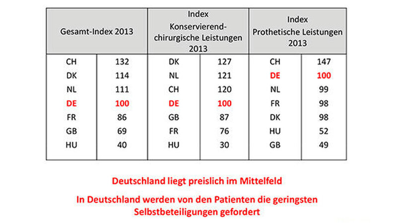 "Die Studie widerlegt , dass Deutschland hinsichtlich des Preisniveaus der zahnärztlichen Versorgung ein Hochpreisland ist", berichtete Studienautor Dr. David Klingenberger. "Im Jahr 2013 liegt Deutschland vielmehr - wie auch schon im Jahr 1999 - im Vergleich zu den europäischen Nachbarn im Mittelfeld. Verantwortlich für die Preisunterschiede zwischen den Ländern seien vielfältige Faktoren, erklärte der stellvertretende IDZ-Leiter: "Die Preise für die zahnärztlichen Leistungen sind jeweils in die einzelnen Gesundheitssysteme eingebettet, deren komplexe Strukturen über lange Zeiträume gewachsen sind."