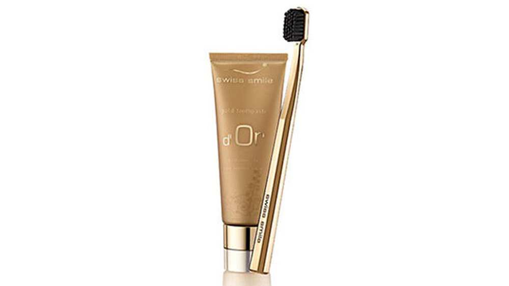 "Das hochwertige Zahngel enthält 23,75 Karat reines Gold in Form von filigranstem Goldstaub und schützt optimal vor Karies. Die vergoldete ultra soft Zahnbürste ist die angemessene Begleitung", verspricht swiss smile auf seiner Website.