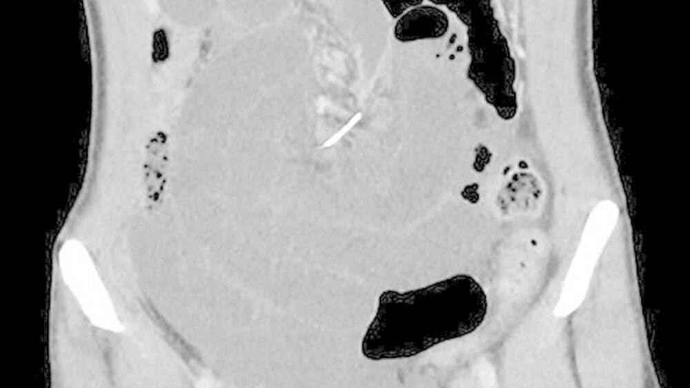 Die bisher gesunde 30-jährige Frau stellte sich in der Notfallambulanz mit angeschwollenem Bauch und starken Bauchschmerzen vor. Zwei Tage später hatten sich die Schmerzen so verschlimmert, dass sie kaum aufrecht gehen konnte.