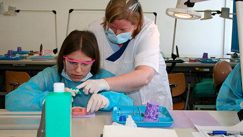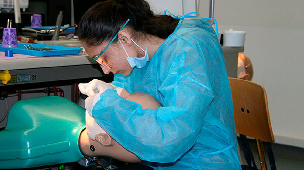 „Das ist Phantomkopf Otto. Er sagt nichts, ist aber trotzdem liebevoll zu behandeln.“ So stellt Zahnärztin Ilona Kronfeld-Möhring den Jugendlichen ihren ersten eigenen „Patienten“ vor. Die Teenager haben bereits Kittel, Mundschutz und Handschuhe angelegt. Jetzt setzen sie ihre Schutzbrillen auf und beugen sich über die Übungsköpfe.