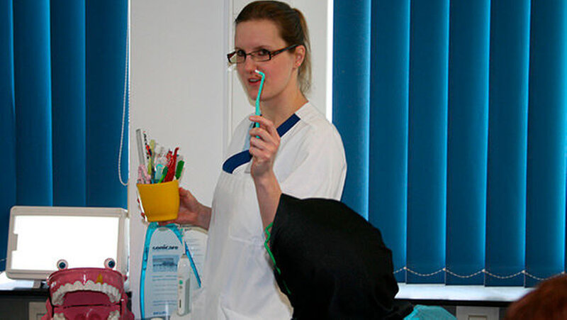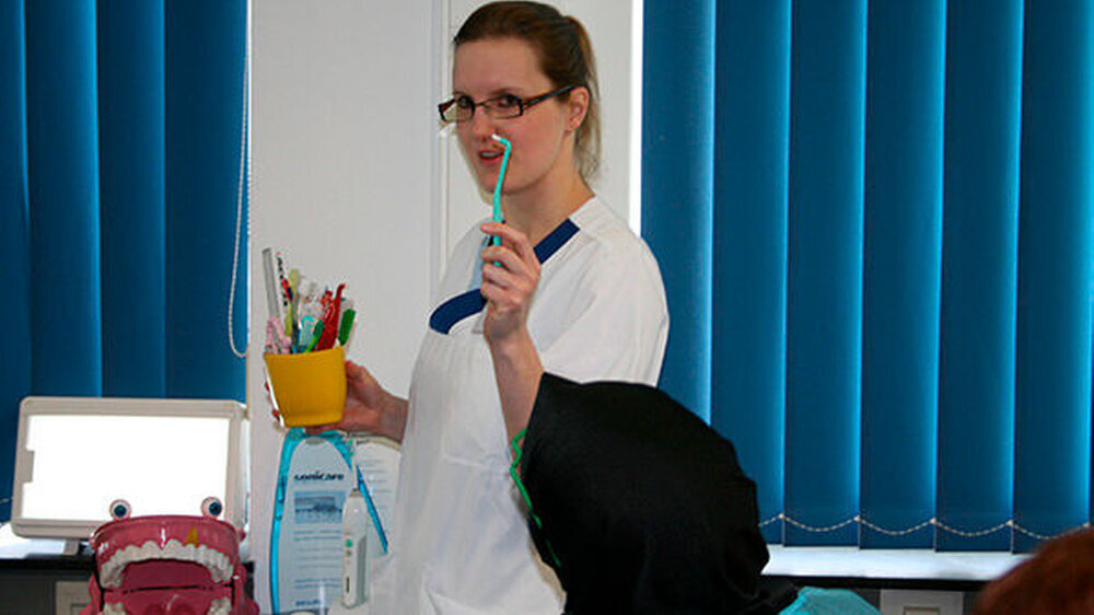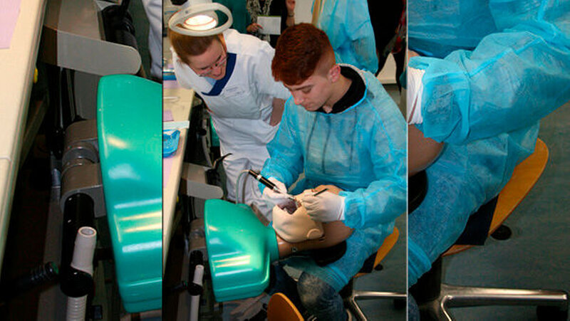 Die 15- bis 16-Jährigen interessieren sich für die Ausbildung zur/m Zahnmedizinischen Fachangestellten. Für die meisten von ihnen ist es der Erstkontakt mit den Tätigkeiten auf der anderen Seite des Behandlungsstuhls. Jetzt dürfen sie selbst Putzen und Polieren üben oder eine Zahnabformung mit Silikon machen.