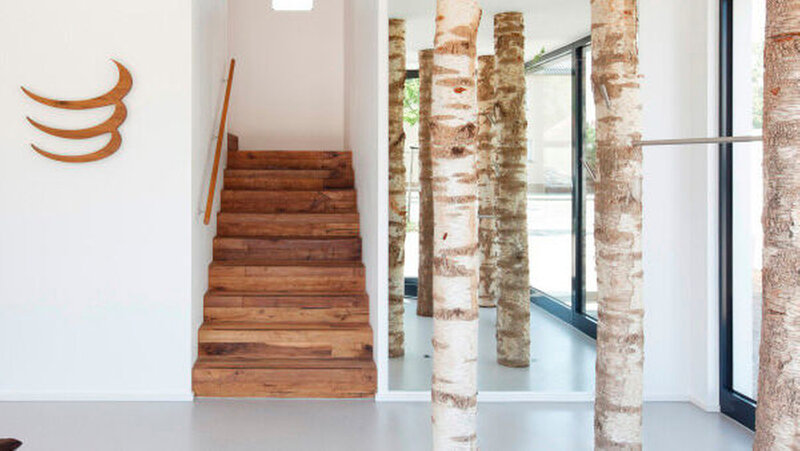 Das ist schon erlebbar, wenn man von draußen hereinkommt: Durch die großzügig verglaste Eingangsfront hindurch blickt der überraschte Patient zunächst auf kleine Tannen und eine Gruppe aus Birkenstämmen, die hier eine naturnahe Garderobe bilden. Linkerhand schließt sich ein als Felsen gestaltetes Empfangsmöbel an, ihm gegenüber vermitteln rustikale Eichenholzwände und ein weiß lackiertes Hirschgeweih die Illusion, man befände sich statt beim Zahnarzt auf einer gemütlichen Berghütte.