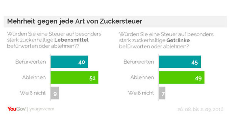 Allerdings: Die Kennzeichnungen des Zuckergehalts reiche den meisten Deutschen nicht aus. Von Packungsangaben, wie viel Zucker ein Produkt enthält, fühlt sich die Mehrheit der Deutschen der Umfrage zufolge nicht gut informiert. 63 Prozent der Befragten finden die Kennzeichnung nicht ausreichend klar, das Gegenteil gaben 29 Prozent an.