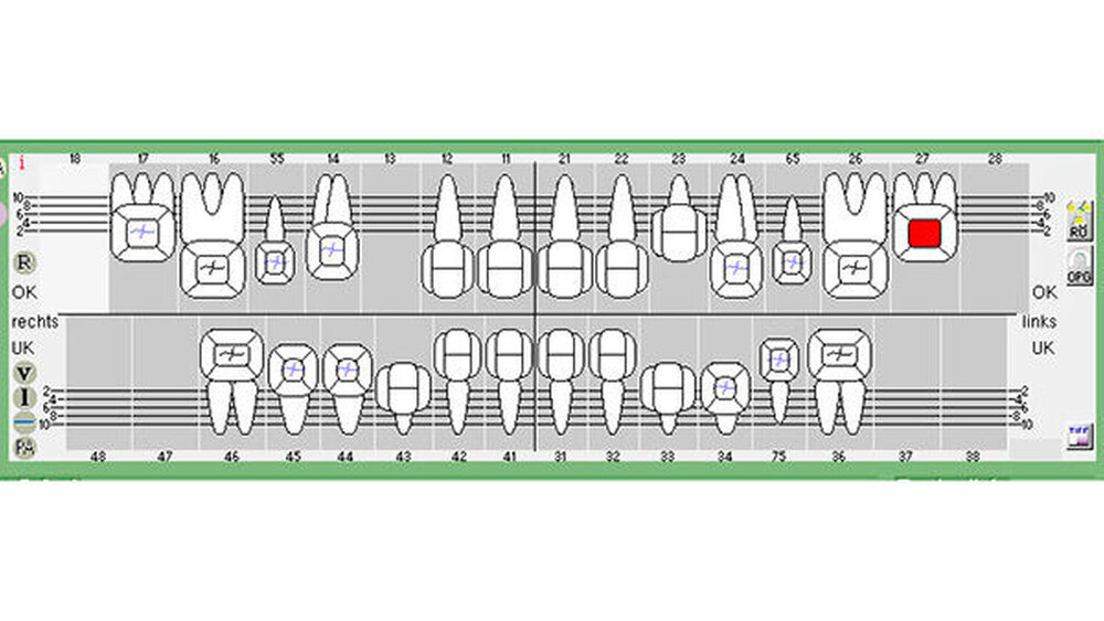 Zahn 27: okklusal-palatinaler Einbruch vorhanden, vipr +, perk -, caries profunda vorhanden, kein Lockerungsgrad